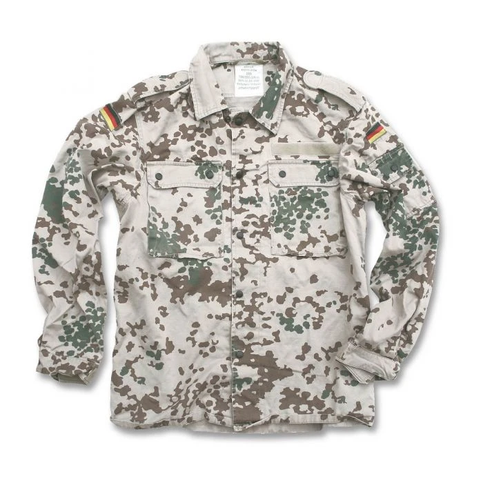 Die Feldbluse in flecktarn ist mit einem Reißverschluss ausgestattet. Das Modell in tropentarn verfügt über eine Knopfleiste auf der Front