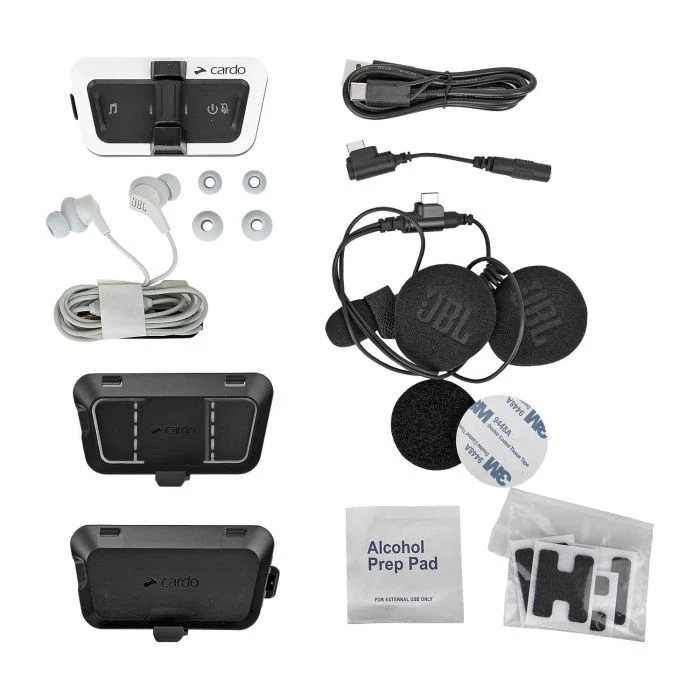 Packtalk Outdoor Gerät, Halterung mit V-Riemen Befestigungsklemme, Klebeplatte, 40 mm Sound by JBL Lautsprecher mit Kabelmikro, Klettverschlusspads für Lautsprecher, Kleber für Lautsprecherkabel, 2 Reinigungspads, USB C zu 3.5 mm audio Adapter, USB Ladekabel