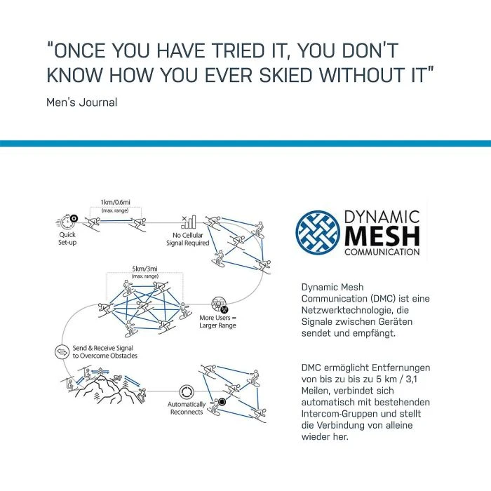 Das Cardo Packtalk Ski Kommunikationssystem zahlt sich nicht nur bei Wintersport aus, sondern ist auch ein sinnvoller Begleiter bei Outdooreinsätzen, Bergtouren und anderen Gruppenaktivitäten im Freien. Kommuniziere, warnt euch gegenseitig vor Gefahren, gebt Tipps in Echtzeit oder plaudert einfach nur. Bleib in ständigem Kontakt zu deiner Gruppe und komme in den Genuss eines kristallklaren Klangs. Packtalk Ski ist das erste Wintersportkommunikationsgerät mit Dynamic Mesh Communication. Das ist eine Netzwerktechnologie, die Signale zwischen Geräten sendet und empfängt. Verbinden Sie sich mit 2 bis 15 Personen und sprechen mit einer Reichweite von bis zu 1 km zwischen jeder Person auf und abseits der Piste miteinander. Das Packtalk Ski funktioniert auch ohne Internet- oder Mobilfunkverbindung. Mit einer Akkulaufzeit von mehr als acht Stunden können Sie den ganzen Tag lang unbesorgt genießen. Packtalk Ski ist wasserdicht und hält härtesten Bedingungen bis -20°C stand. Nebengeräusche wie Wind werden gefiltert und unterdrückt, so ist eine reibungslose und klare Kommunikation gewährleistet.