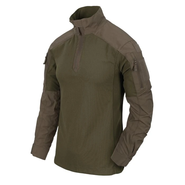 Das Combat Shirt von Helikon-Tex ist hoch atmungsaktiv. Der Rumpf ist aus einem leichten TopCool Gewebe gefertigt, die Ärmel und der Stehkragen aus strapazierfähigem Nyco-Mix. Auf den Oberarmen befinden sich kleine Taschen mit Reißverschluss. Das Shirt eignet sich perfekt für heiße Tage, besonders in Kombination mit Plattenträgern, Brustpanzern oder anderen Westen.