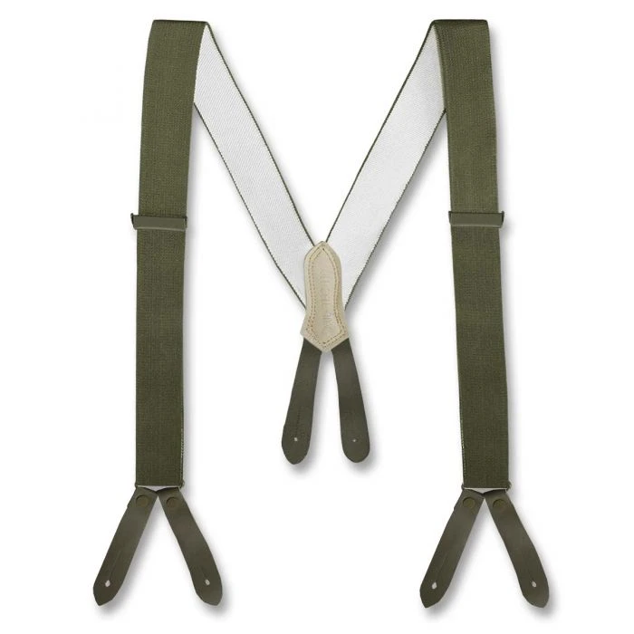 Klassische Hosenträger der Bundeswehr, gefertigt aus elastischem Band. An den Enden befinden sich Lederlaschen zum Einknöpfen in die Feldhose oder Moleskinhose (an die dafür vorgesehenen Hosenknöpfe) und Klemmdeckelschnallen zum Einstellen der Länge.