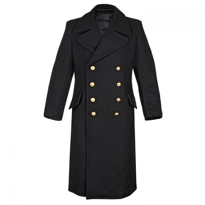 Eleganter, langer BW Marinemantel im klassischem Look und mit den typischen, große Knöpfen mit Ankermotiv.