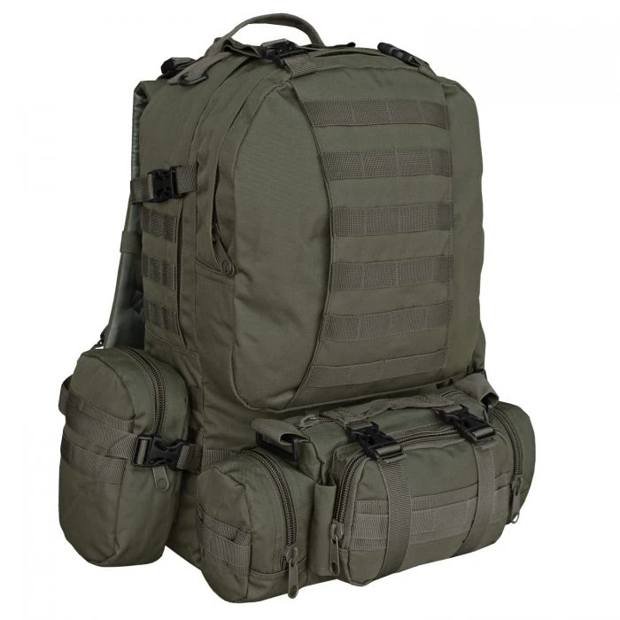 – diverse Molle-Aufnahmeschlaufen an Rucksack, Seitentaschen und Hüfttasche