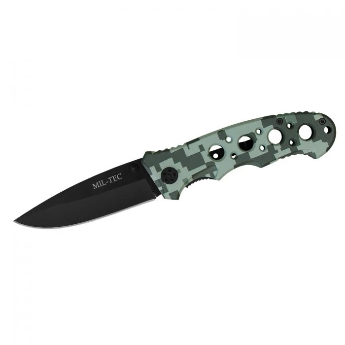 Handliches Taschenmesser mit tarnfarbenen Griff und schwarzer Klinge von Mil – Tec.