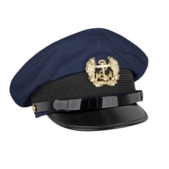 Schirmmütze der deutschen Marine, aufwendig verarbeitet und mit Abzeichen (Anker im Eichenkranz) aus Metall versehen. Zudem ist die Marine Schirmmütze im Innern mit einem Leder-Schweißband ausgestattet.