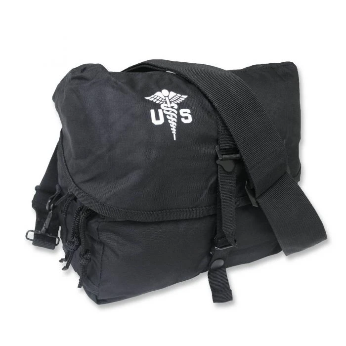 Nachbildung des US Medical Kit Bag in robuster Ausführung und mit viel Stauraum. Eine große Tasche, zwei kleinere, ausklappbare Taschen. Alle reißverschließbar. Der Überschlag läßt sich mit einem verstellbarem Riemchen per Druckknopf schließen. Abnehmbarer Schultergurt. Abmessungen: ca. 25 x 24 x 13 cm, Material: 100% Nylon.