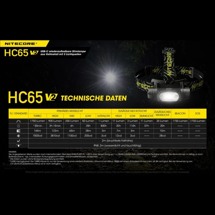 Im Lieferumfang enthalten: Kopflampe Nitecore HC65 V2, Kopfband, Nitecore Li-Ion Akku mit 3500mAh (NL 1835HP), USB- Ladekabel, Erssatzdichtring