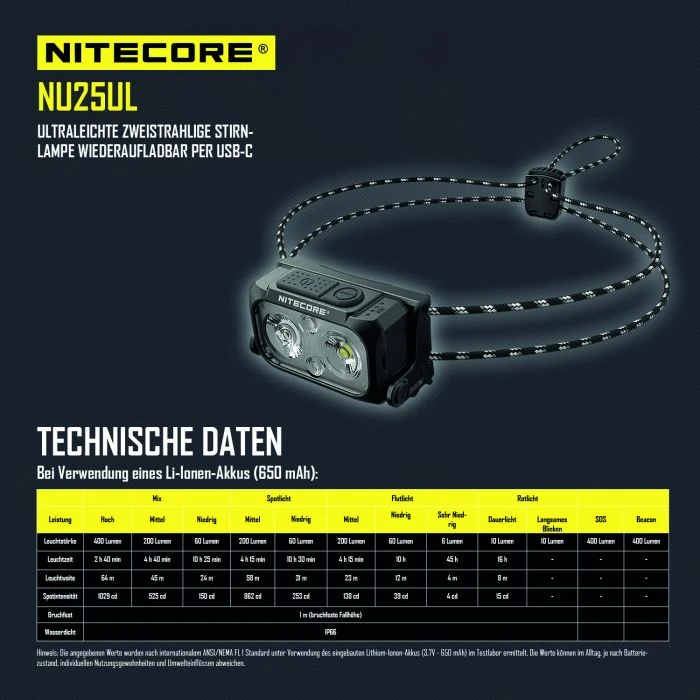 Die Nitecore NU25 Ultralight ist mit einem besonders leichtem Kopfband und einem kleineren Gehäuse ausgestattet, wodurch das Gewicht der Lampe gerade mal auf 45 g reduziert ist. Die Kopflampe verfügt über drei Leichtmittel, zwei Haupt-LEDs für Spot- und Flutlicht sowie zwei Rotlicht-LEDs. Die Lampe kann schnell und einfach vom Kopfband getrennt werden um dieses zu reinigen. Sie verfügt über einen integrierten Li-Ion Akku (650mAh) und einen USB-C Ladeport in der Lampe.