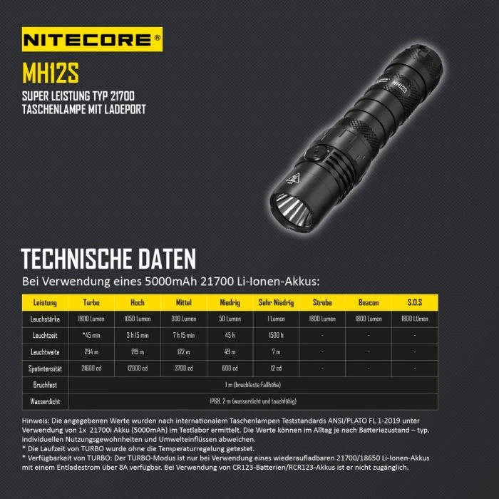 Lieferumfang: Nitecore MH12S, Li-Ion Akku (21700/5000mAh), USB-C-Ladekabel, Kunststoffholster NTH10, Clip, Batteriemagazin, Handschlaufe, Ersatzdichtring