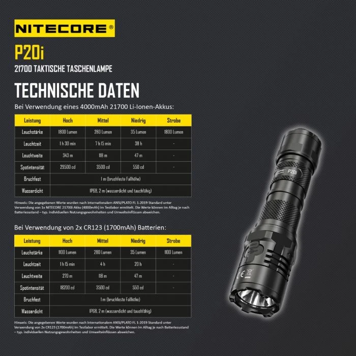 Lieferumfang: Nitecore P20i, 21700 Li-Ion Akku TYP NL2140i mit 4000mAh, Tactical Holster NTH20, Clip, Lanyard, Ersatz-Dichtring, Batteriekäfig, USB-C-Ladekabel