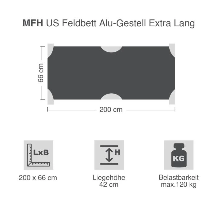 Das extra lange US Feldbett von MFH ist ein robuste und strapazierfähige Outdoor-Liege mit verstärktem Alu-Gestell.